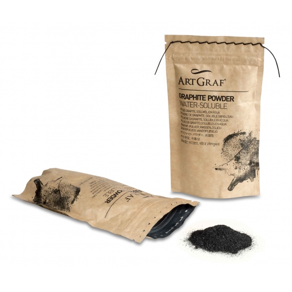 ArtGraf Aquarel grafietpulver zakje van 100 g kan rechtstreeks of met toevoeging van water van diepe zwarte tot transparante grijstonen verwerkt worden.