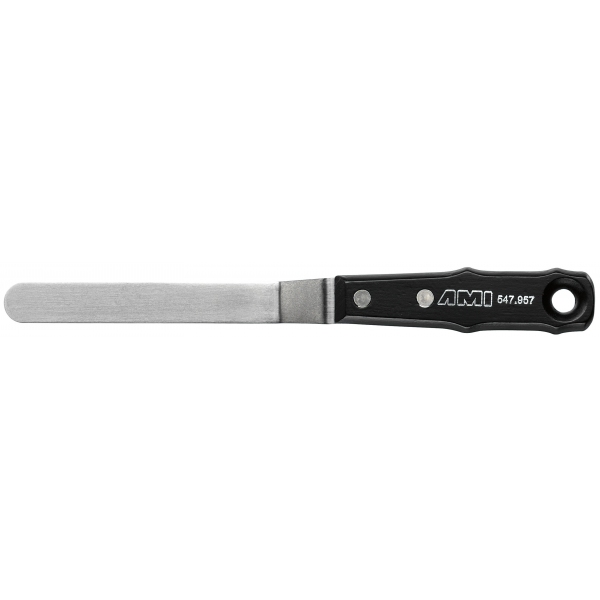 Schildersmes met elastisch stalen blad en zwart gelakte ergonomische handgreep.