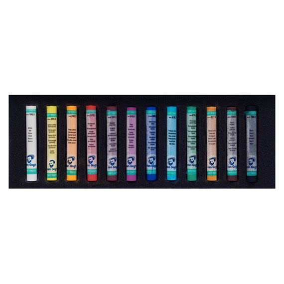 Deze starterset met 12 pastels bevat de volgende algemene kleuren:Wit (100.5) – Donkergeel (202.5) – Citroengeel (205.5) – Gele oker (227.5) – Kraplak donker (331.3) – Permanentrood (372.5) – Omber gebrand (409.5) – Ultramarijn donker (506.5) – Roodviolet (545.5) – Phtaloblauw (570.7) – Permanentgroen donker (619.5) – Zwart (700.5).