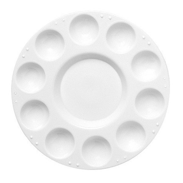 Wit kunststof rond palet, Ø 15 cm met 10 ronde vlakken en in het midden een grotere ronde uitsparing om verf te mengen.